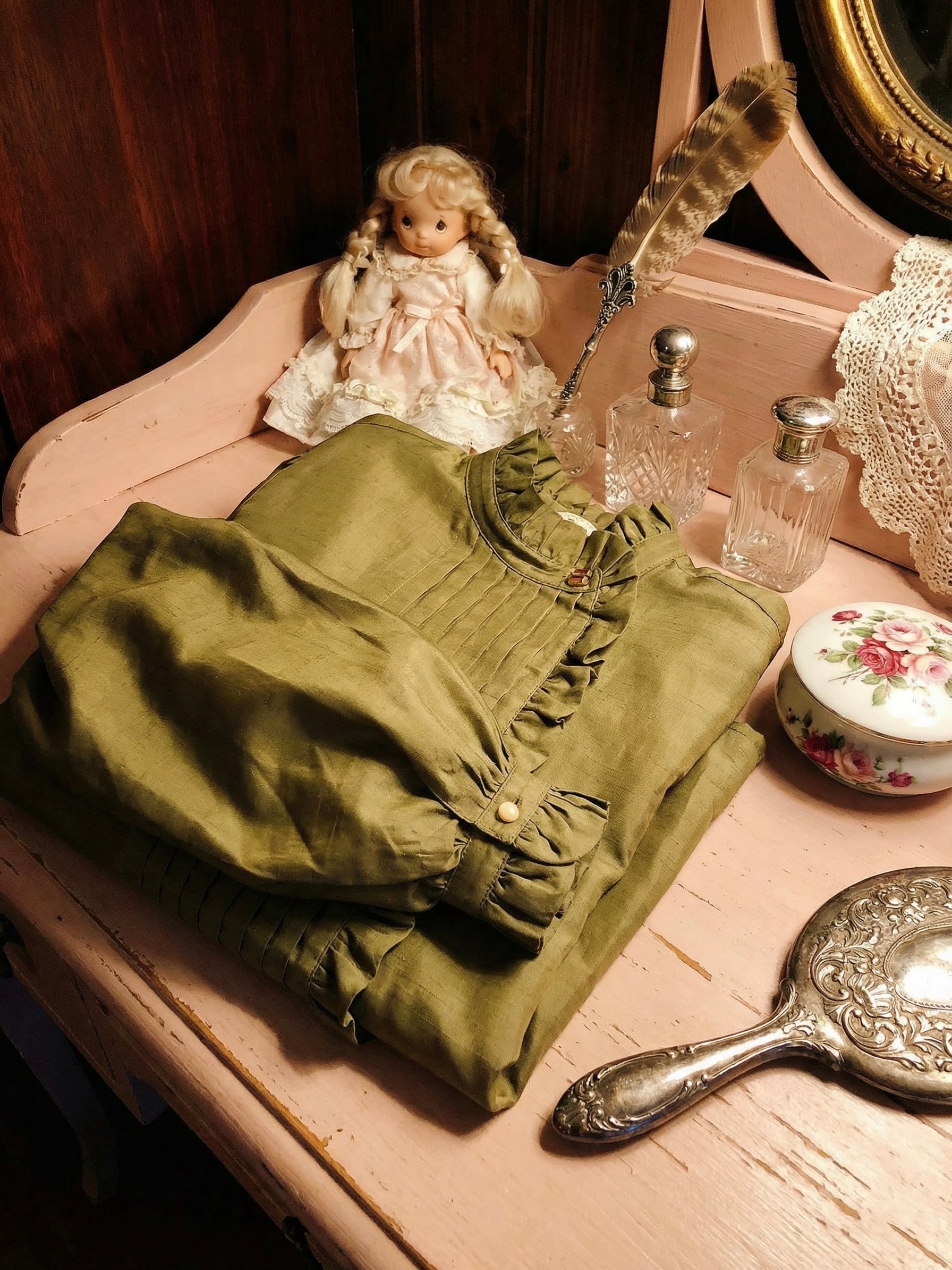 日本製維多利亞禮儀服飾篇古典綠側衣襟王子服收藏 罕有的古典綠配合維多利亞側衣襟剪裁、復古壓摺、荷葉邊小企領、公主膊、燈籠袖、袖級荷葉邊集一身高訂禮服 擁有公主裳、王子服,距離夢遊維多利亞時代就只差那一毫米,APV帶引你觸摸到的都是屬於淑媛、閨秀的古典精緻 肩膊: 37.5cm 胸圍: 104cm 腰圍: 102cm 䄂長: 59cm 全長: 60cm 質料: 綿混纖維 口袋: 無 肩墊: 無 製造: 日本製 🤍任何問題歡迎按「查詢」聯絡本店